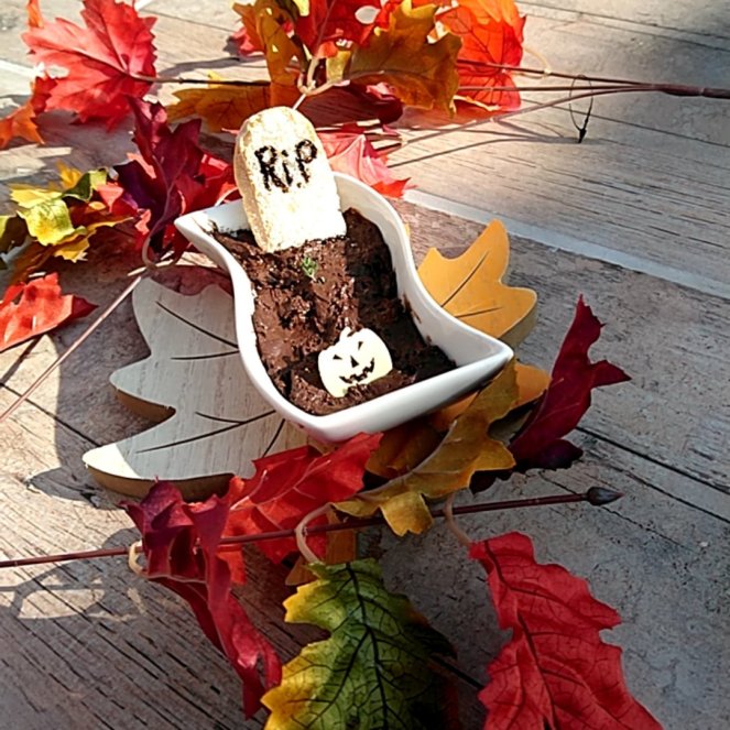 Et pour ce qui est du thème d’halloween, eh bien tout simplement présenter la mousse en forme de pierre tombale.