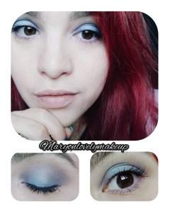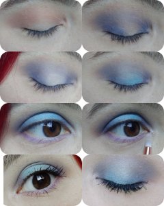 Tout d’abord j’ai mélangé les deux fards brun (1) dans le creux pour en faire la couleur de transition. Puis j’ai appliqué le fard bleu (2) dans le coin interne et externe. En estompant ensuite j’ai rejoint les 2 côtés sur le dessus au niveau du creux. Puis j’ai nettoyer le centre de la paupière avec de l’anticerne, ainsi j’ai pu appliqué le bleu turquoise (3) sur le centre.