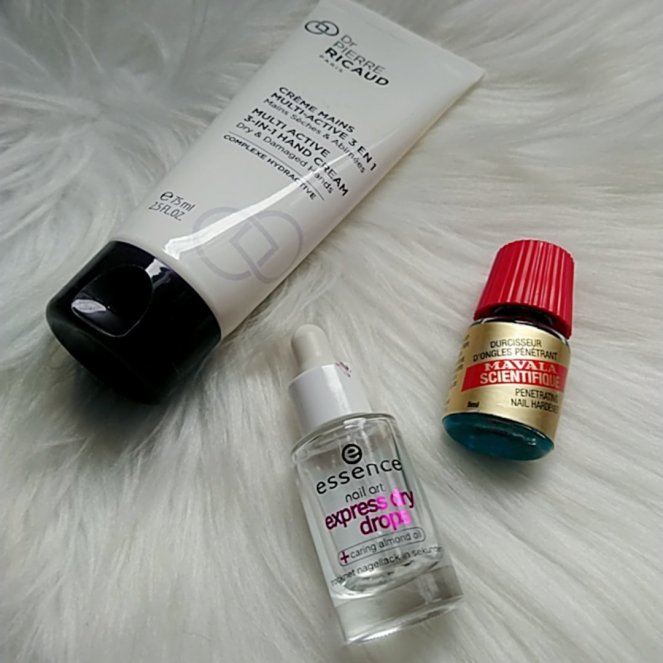 Pour cette catégorie j’y ai mis le soin durcisseur des ongles de Mavalla. Je l’avais arrêté il y a une période mais en ce moment mes ongles se cassent assez fréquemment donc je recommence à l’appliquer à chaque fois que je me refais une manucure, le plus souvent 2fois par semaine. J’inclus dans cette catégorie le goute à goute sèche vite de chez essence. Il permet de faire sécher le vernis en moins de 30secondes mais également d’hydrater les cuticules. Je vous parle également de la crème pour les mains de Dr Pierre Ricaud. Cette crème est très hydratante, elle sent vraiment super bon et elle ne laisse pas de filme gras sur les mains.