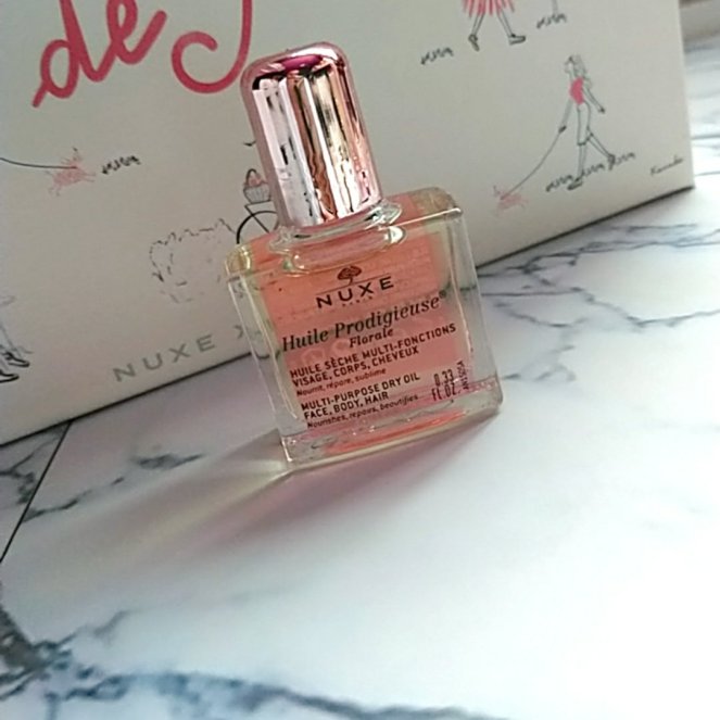 ° tout d’abord une miniature de l’huile prodigieuse florale qui est la toute nouvelle version de l’huile prodigieuse que nous connaissons dĂ©jĂ . On peut appliquer cette huile sĂšche aussi bien sur le Corp que sur les cheveux pour hydrater. L’odeur est trĂšs agrĂ©able et pas trop forte. Vous pouvez la commander sur le site de Nuxe en grand format (100ml) Ă 24âŹ90.