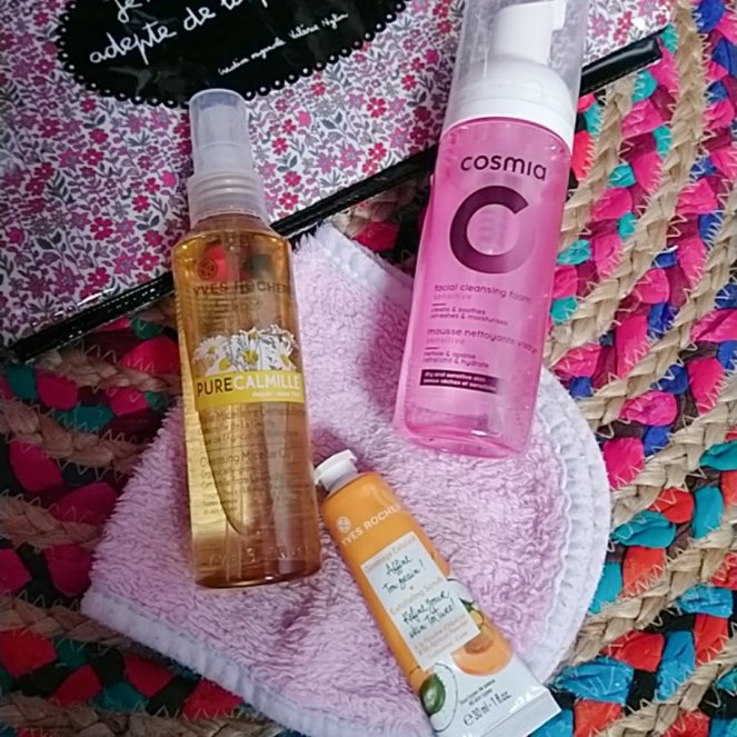 On commence avec une huile démaquillante de chez Yves rocher. Même si je ne compte pas me maquiller tous les jours et toujours très léger d’ailleurs ! Et pour nettoyer tout ça, une serviette démaquillante tes pratique ! Pas besoin d’emporter de cotons ! Pour continuef avec le nettoyage je prends un gommage visage et une mousse nettoyante. Je pense prendre mon savon d’alep également.