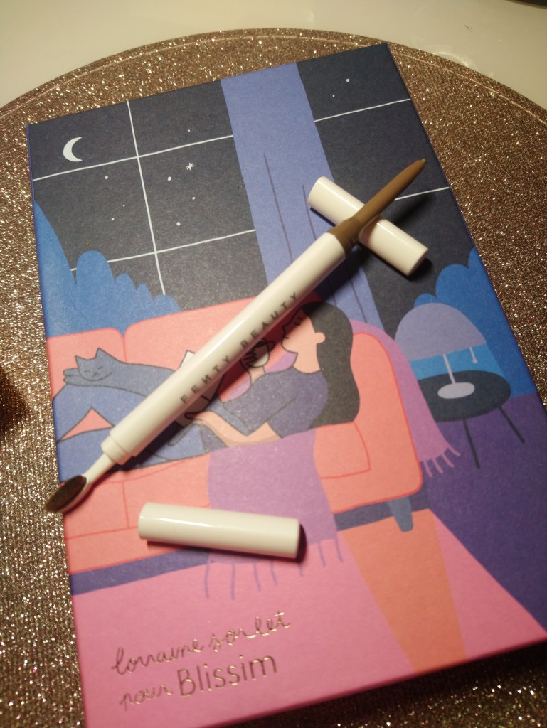 * Ultra fine Brown pencil and styler de chez Fenty Beauty. Nous avons donc reçu le crayon à sourcil de la marque de Rihanna. Je l’ai eu en teinte ash Brown. J’avais peur qu’il ne soit trop clair mais au final il me correspond plutôt bien. Je l’ai donc déjà testé plusieurs fois. Je le trouve un peu sec ce qui fait qu’il faut pas mal appuyer pour qu’il marque et donc la mine rétrécie assez vite. Par contre le côté brosse je le trouve vraiment bien. Il estompe comme il faut et place correctement les poils. Malheureusement ce produit n’est pas disponible sur le shop de Blissim.