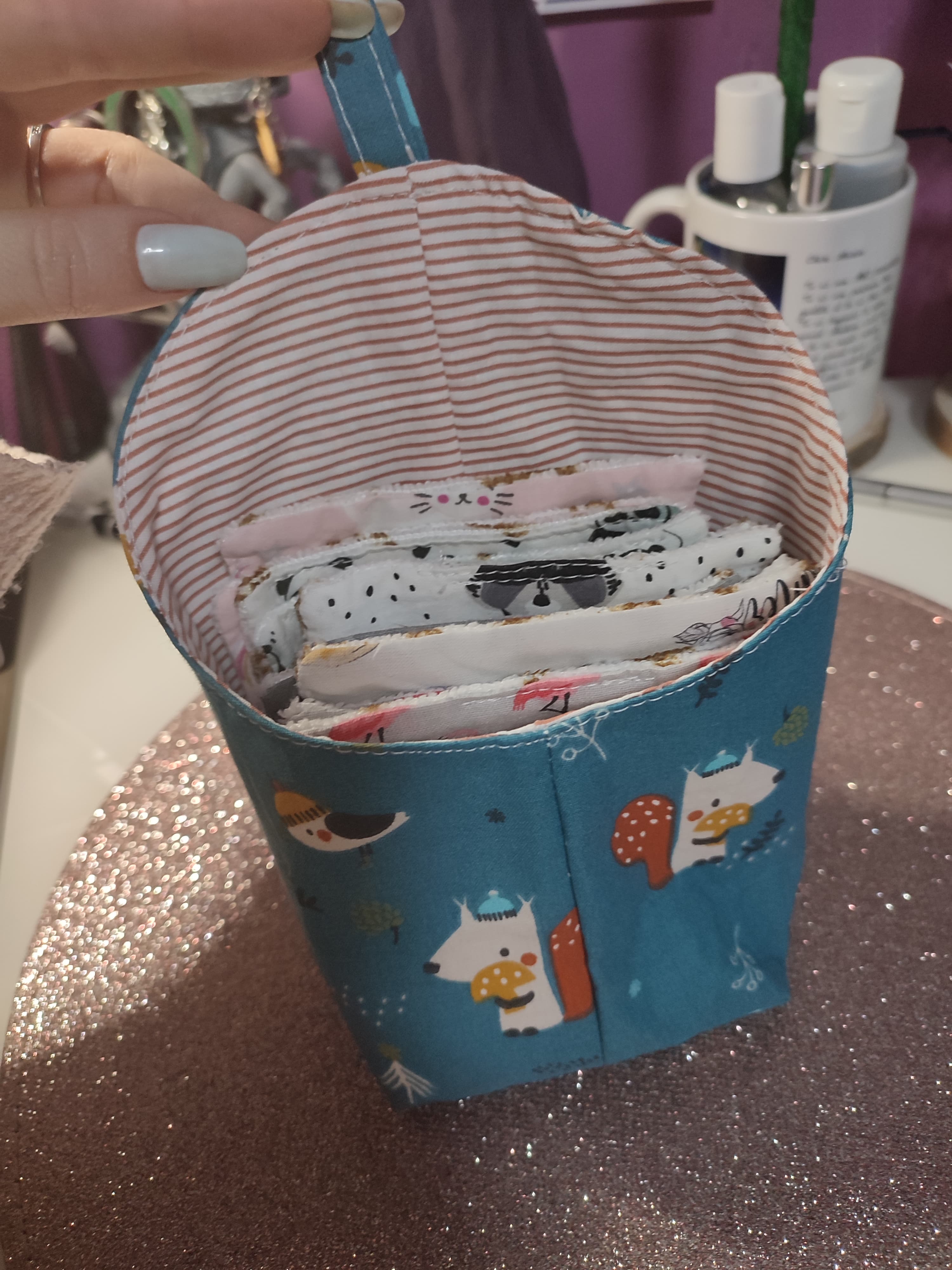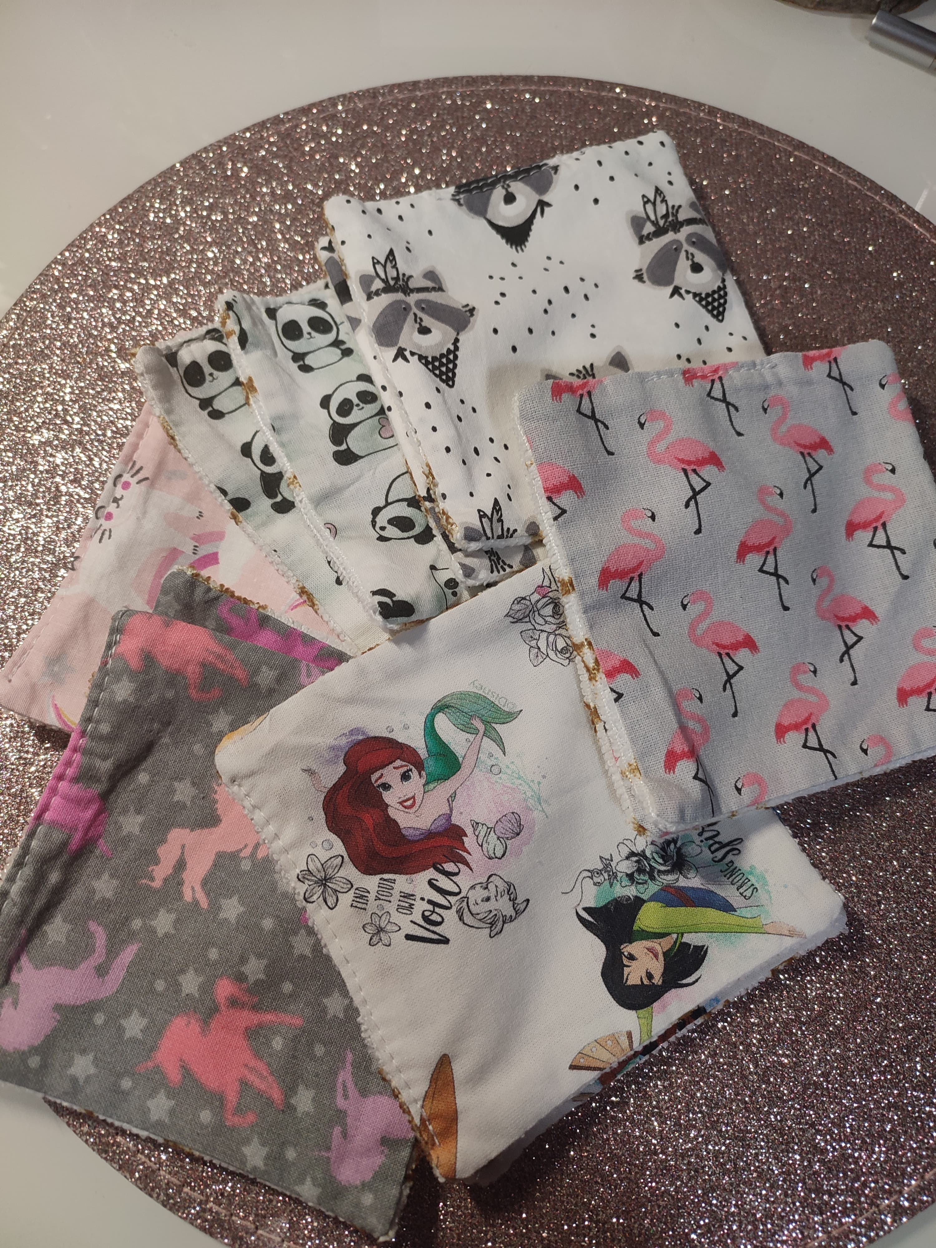 • De la part de ma filleule et de sa famille , j’ai eu des lingettes démaquillantes faites maison ainsi que le support à accrocher. J’aime énormément utiliser ce genre de produits. Faites maison c’est encore mieux . Donc je suis super contente de ce cadeau.