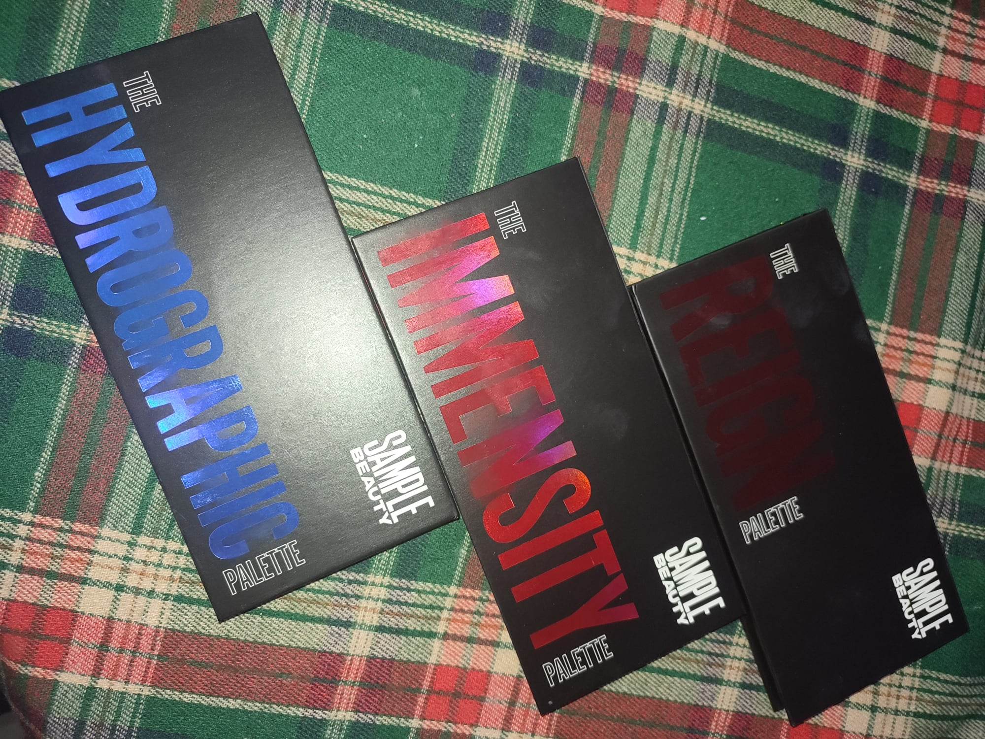 On démarre avec Sample Beauty. Je n’avais jamais testé cette marque et j’ai profité d’une petite réduction sur Beauty Bay pour m’acheter ce trio de palettes. Ce sont toutes des palettes de 10 fards . Il y a la Hydrographic pour commencer. Palette dans les teintes vertes , violettes et bleues. Il y 7 fards mattes et 3 fards légèrement irisés. Je n’ai pas encore eu l’occasion de la tester . On poursuit avec la Immensity. Une palette arc en ciel entièrement matte. Celle ci aussi je ne l’ai pas encore testé. Elle fait partie des prochaines à essayer. La dernière est la Reign. Dans celle ci il y 7 fards mattes et 3 irisés. C’est une palette de nude par excellence. J’ai déjà eu l’occasion de la tester et les fards sont bien pigmentés et se travaillent bien. Ca me donne encore plus envie de me pencher sur cette marque et de voir les autres palettes qu’ils peuvent proposer. En avez -vous à me recommander?
